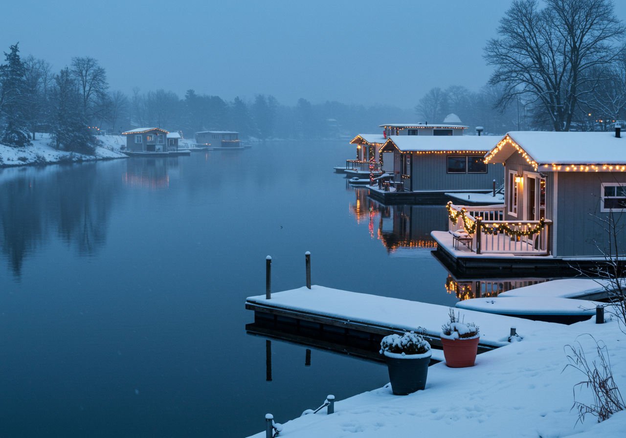 Well, for the city and Seattle floating homes the "Seattle freeze" has been alive and well in recent years during winter months. As temperatures drop and it snows in Seattle, there are some things to note that are important on a houseboat. When it snows on a floating home or houseboat, the biggest concern is usually removing the excess weight off the top and decks of your home as they were not built to withstand the additional load. Snow loads can make them top-heavy and tipsy or even worse - sink them if the floatation is not adequate.